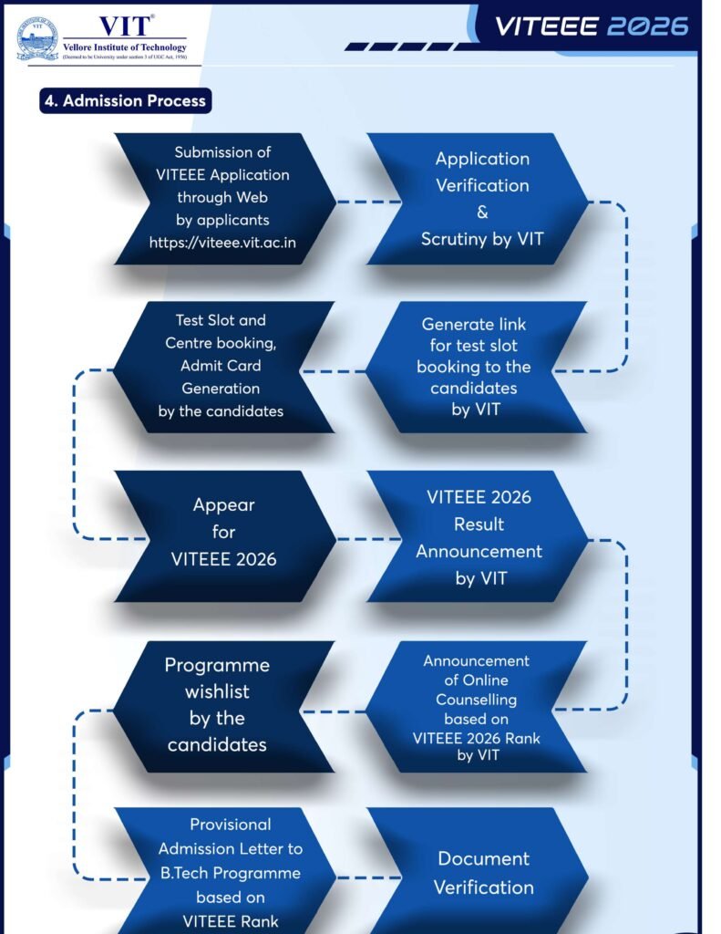 - Admission is based on the rank achieved in the Computer Based Test (CBT) of VITEEE 2026.